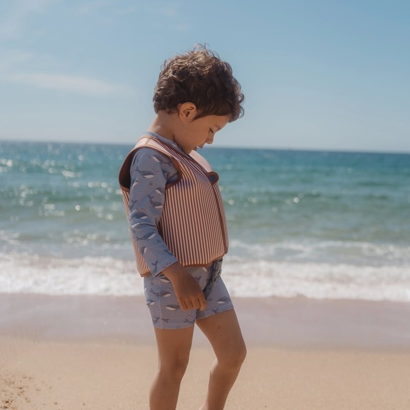 Kamizelka do nauki pływania Ocean World od Little Dutch. Wytrzymała brązowa kamizelka wypornościowa Ocean World to niezastąpiony towarzysz małych miłośników wody. Wesołe paski i uroczy nadruk wieloryba sprawiają, że kamizelka jest nie tylko funkcjonalna, ale też przyciąga wzrok na plaży i przy basenie.