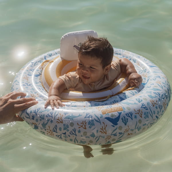 Pływający fotelik w formie okrągłego siedziska idealnie sprawdzi się do oswajania małego dziecka z wodą oraz początków nauki pływania. Koło posiada siedzisko z miejscem na nóżki zabezpieczające malucha przed zsunięciem się do wody, natomiast dmuchane oparcie zapewni bezpieczeństwo i komfort podczas przyjemnego unoszenia się na wodzie.