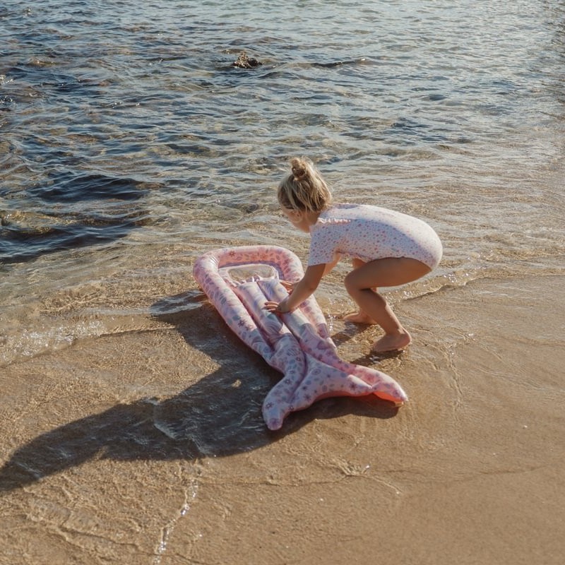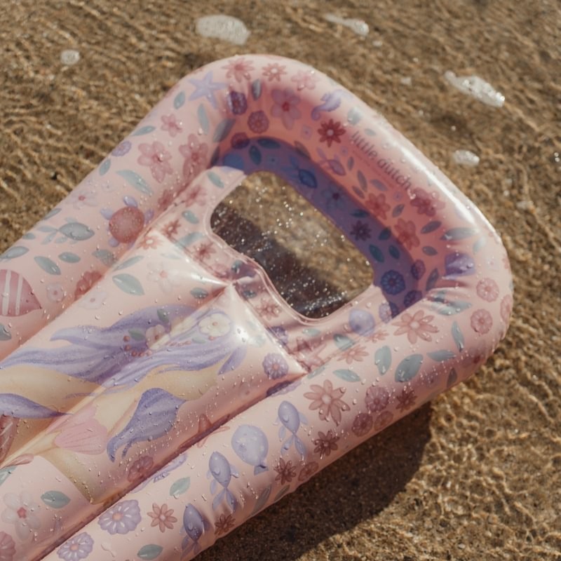 Różowy materac dmuchany Dreamy Mermaid zabiera malucha w relaksującą, pełną wyobraźni przygodę na wodzie. Delikatny róż, uroczy kwiatowy wzór oraz figlarny ogon syrenki sprawiają, że materac wyróżnia się na plaży czy basenie przyciągając spojrzenia dzieci i dorosłych