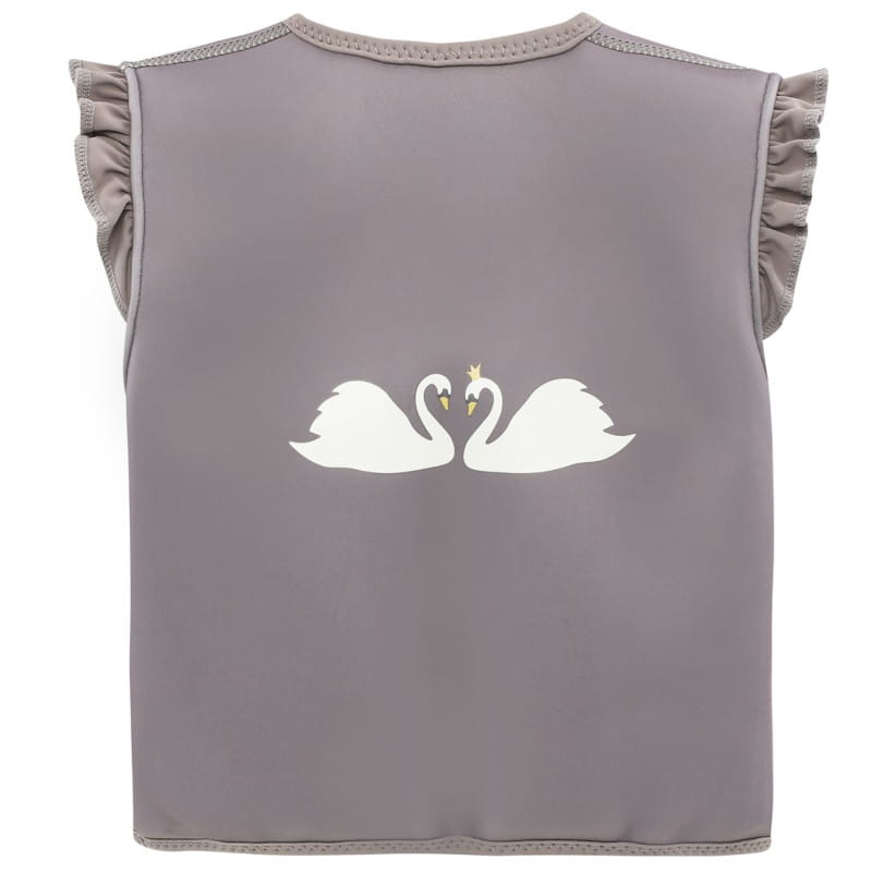Neoprenowa kamizelka wypornościowa w ciemno beżowym kolorze z delikatną falbanką na ramionach i cudownymi łabędziami królewskim na plecach świetnie sprawdzi się podczas nauki pływania i zabawy.