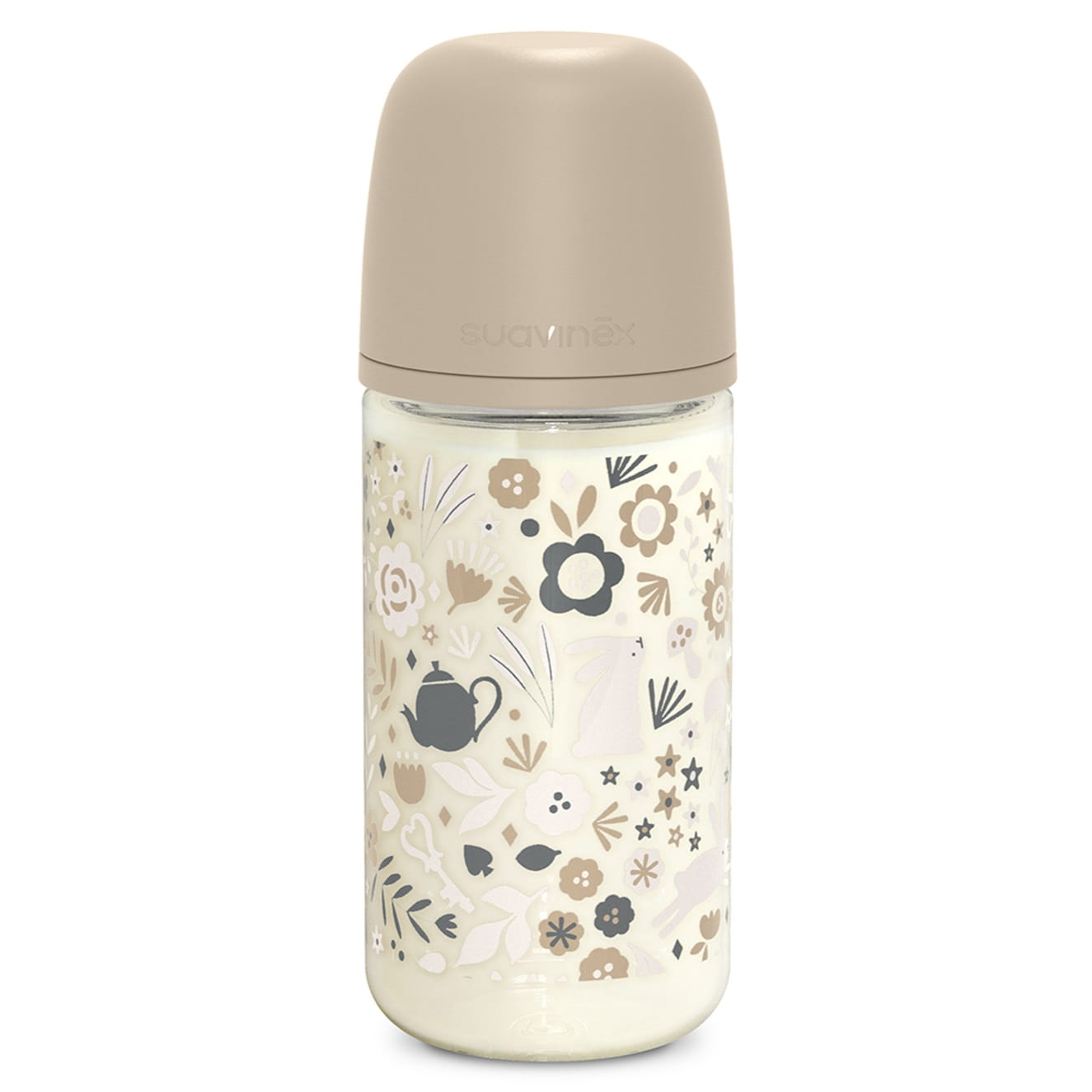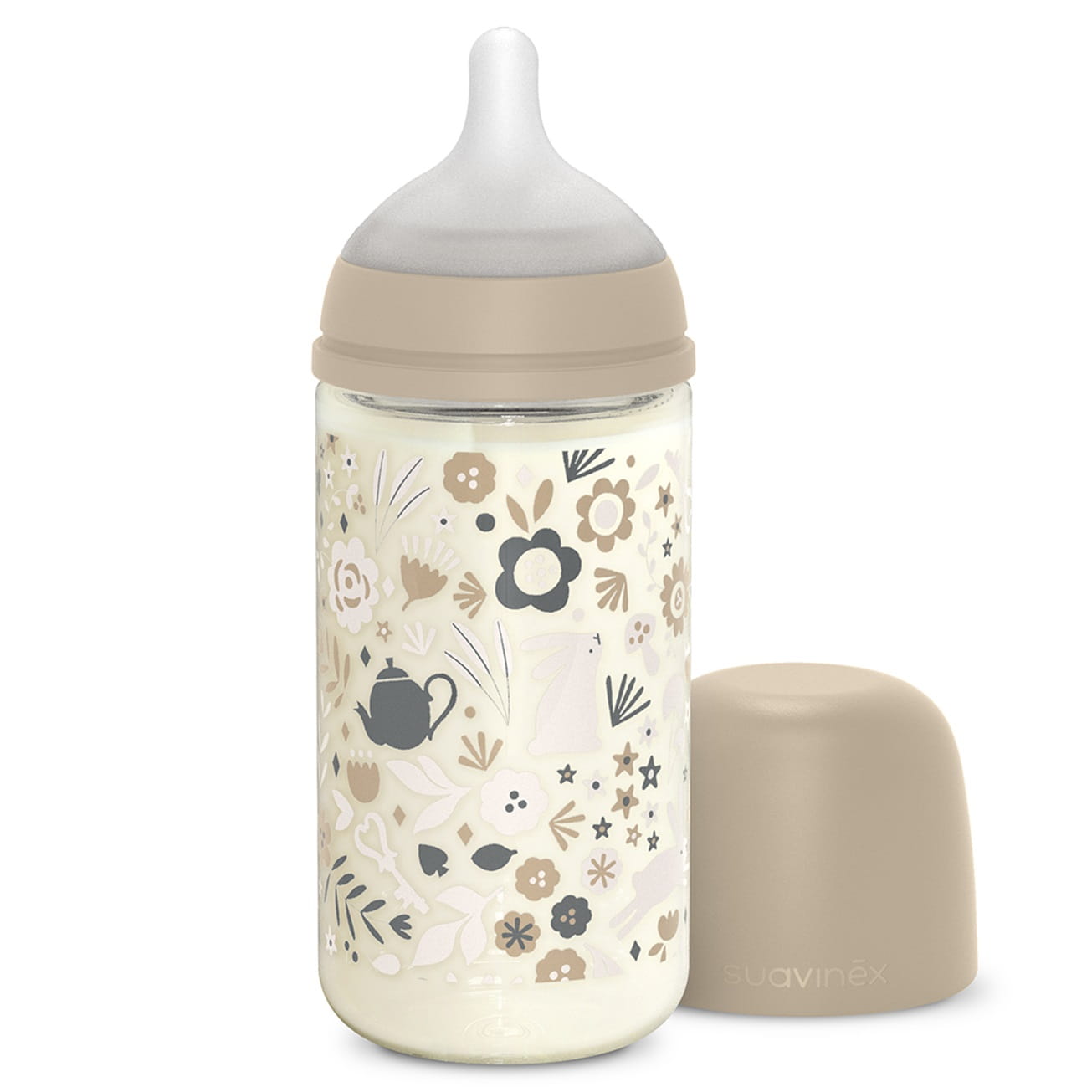 Szklana butelka do karmienia niemowląt BEŻOWA LIBERTY 240 ml ze smoczkiem SX Pro o średnim przepływie francuskiej marki Suavinex.