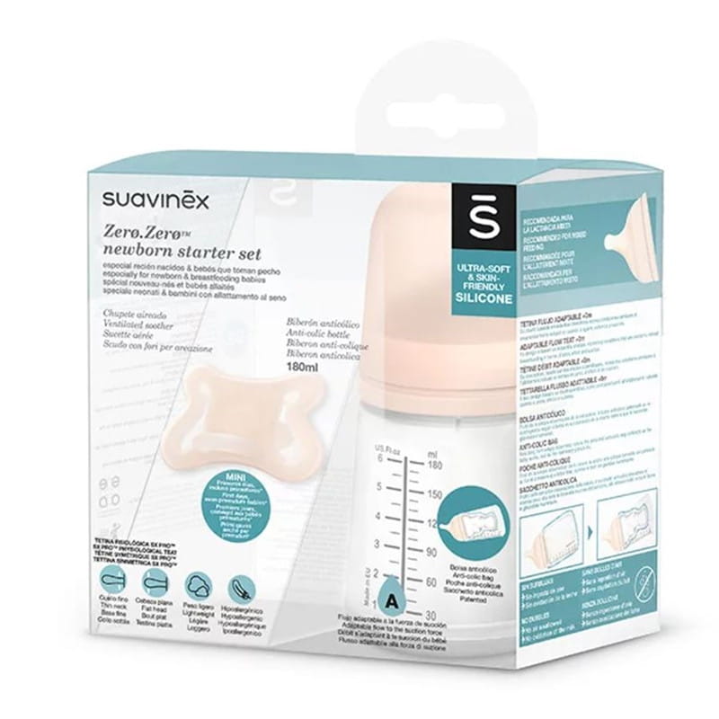 Zestaw startowy Zero Zero z butelką o regulowanym przepływie 180 ml i smoczkiem mini dla niemowląt francuskiej marki Suavinex.