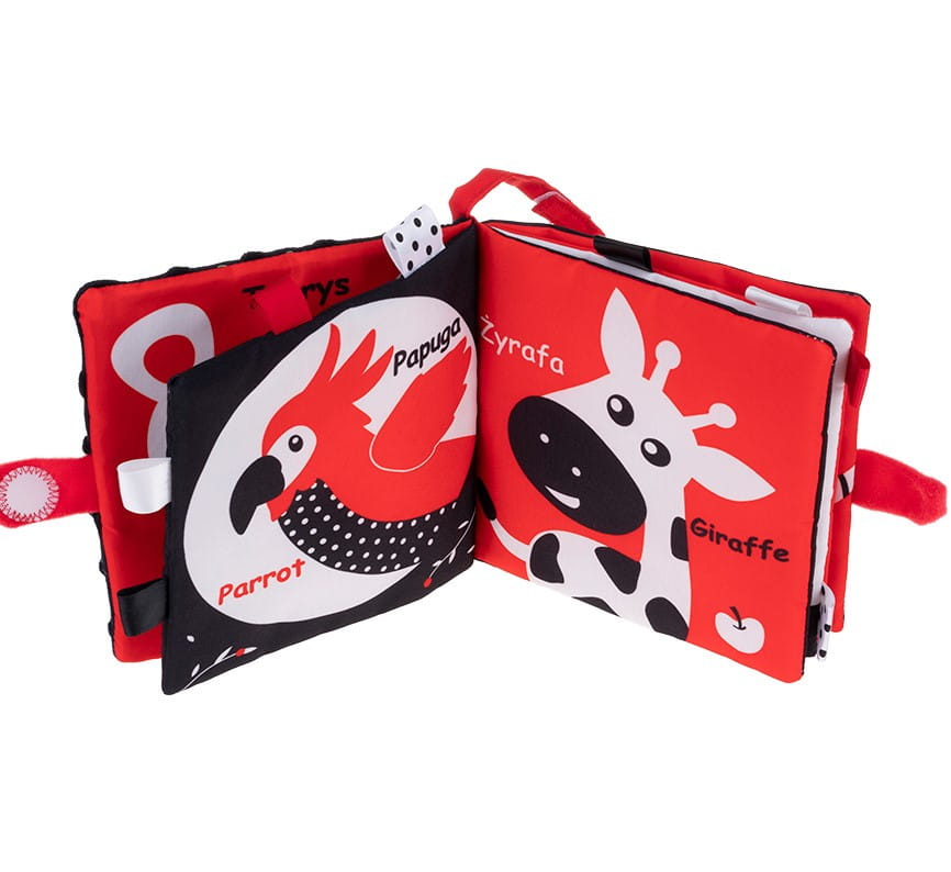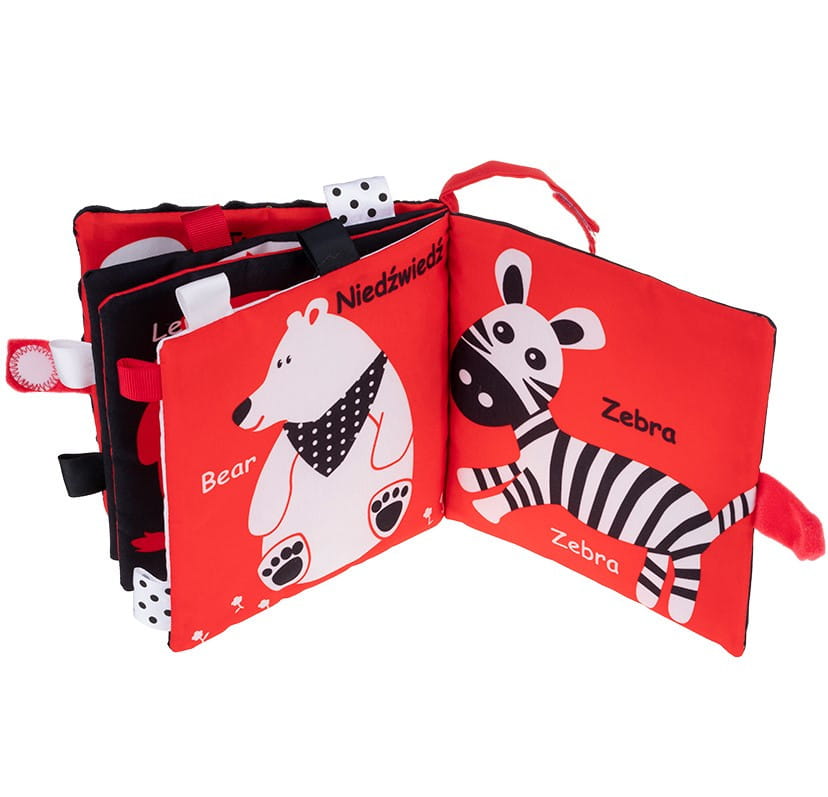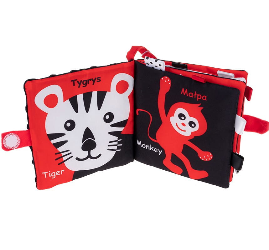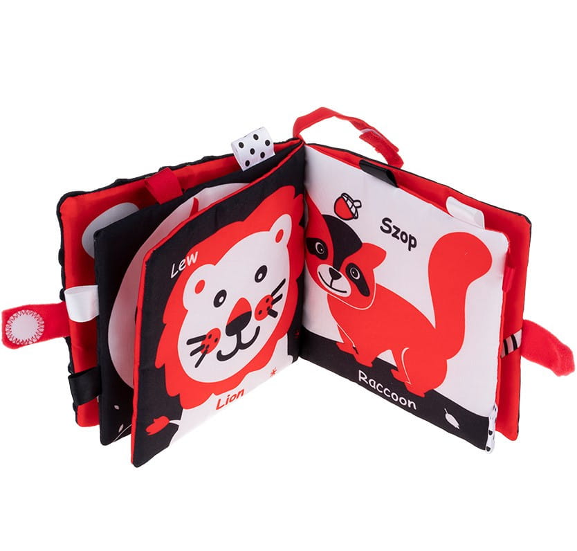 Materiałowa, miękka książeczka przybliży maluchom wygląd dziki zwierząt i nauczy ich nazw. Na dziesięciu stronach znajdziemy podobiznę zwierzaka wraz z jego nazwą w języku polskim oraz angielskim. Okładka książeczki szeleści, co uatrakcyjnia zabawę i stymuluje zmysły malucha, a bezpieczne lusterko, posłuży do samopoznania dziecka. Praktyczna zawieszka na rzep ułatwi zaczepianie książeczki sensorycznej w dowolnym miejscu.