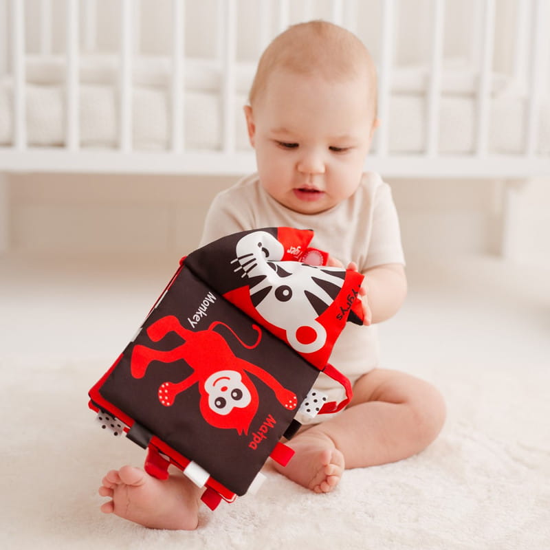 Książeczka Farma marki Jolly Baby to kontrastowe obrazki i sensoryczne elementy do zabawy dla maluszka.