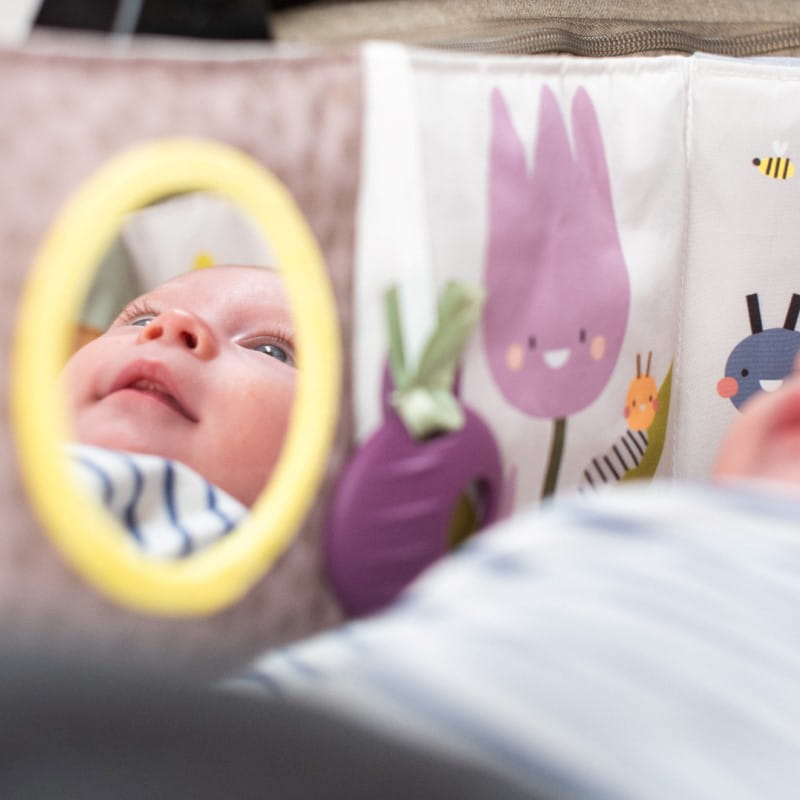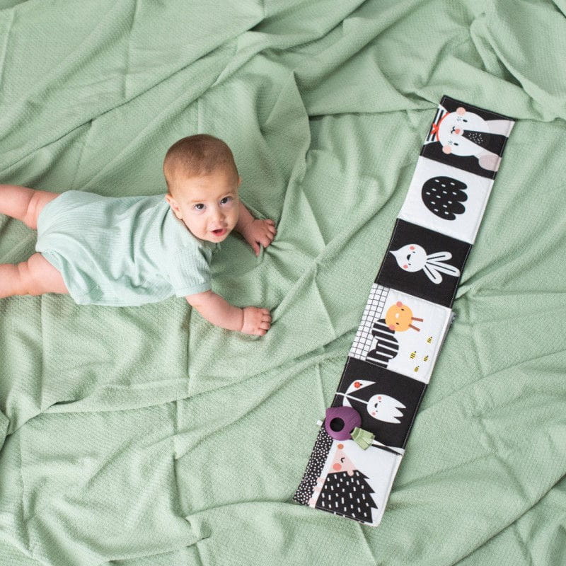 Zawiera bezpieczne dla dziecka lusterko, szeleszczące strony, sensoryczne tekstury i burakowy gryzak.