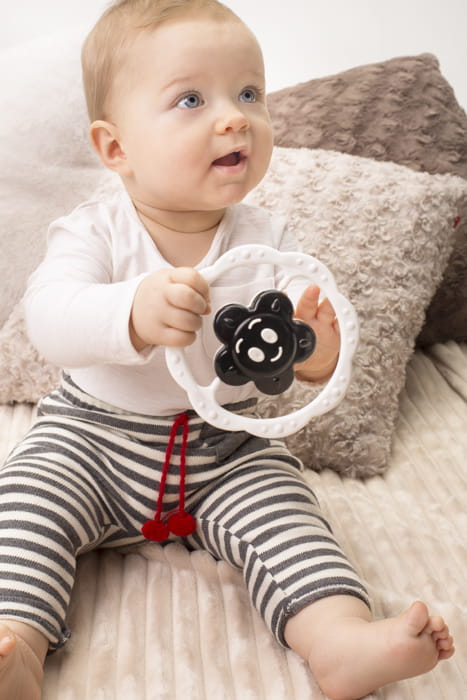 Zestawienie kolorystyczne zabawki idealnie stymuluje zmysł wzroku u niemowlaka, a delikatny dźwięk grzechotki - zmysł słuchu. Różne struktury powierzchni rozwijają zmysł dotyku, a lekka konstrukcja oraz nieduży rozmiar zachęcają do chwytania.