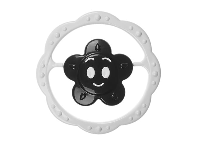 Środek grzechotki to obrotowe słoneczko - z jednej strony białe, z drugiej - czarne.