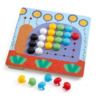 Pierwsza mozaika z grzybkami PRIMO marki djeco to 8 plansz i kolorowe elementy do wciskania i tworzenia obrazków.