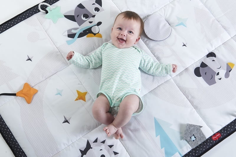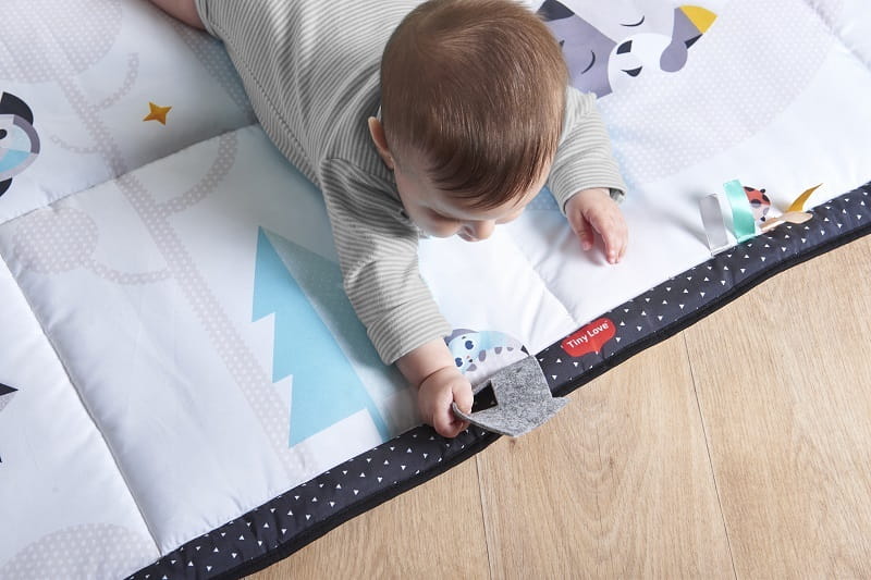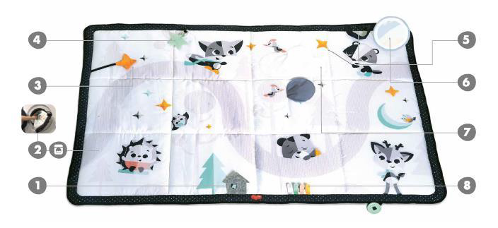 - Ruchy całego ciała - obszar do zabawy pozwala dziecku na rozciąganie, turlanie i ćwiczenie swojego ciała, a interaktywne elementy zachęcają do leżenia na brzuszku.