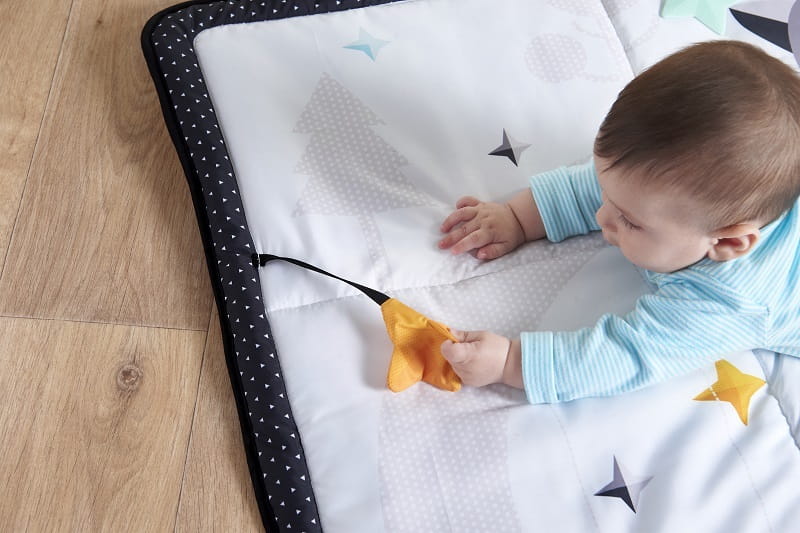 Biało-czarne kolory maty będą stymulować wzrok dziecka już od pierwszego dnia życia, duży rozmiar maty zapewni bezpieczną przestrzeń do zabawy, a dołączone zabawki i ciekawe elementy maty będą wspierać rozwój sensoryczny Maluszka.