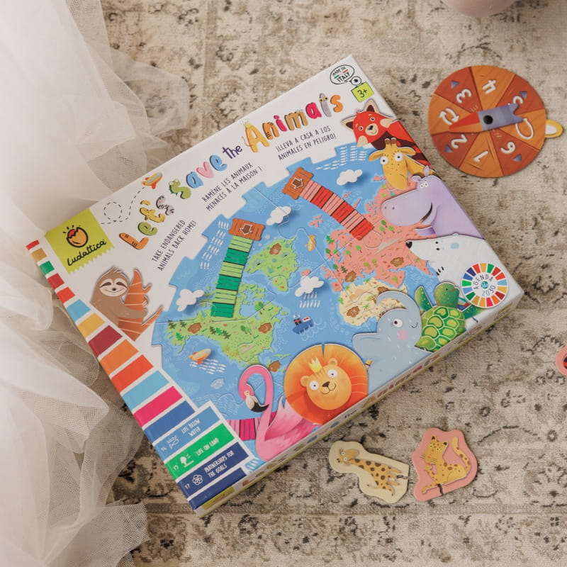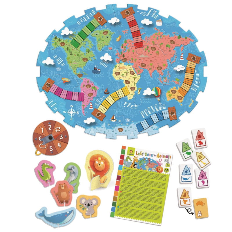 Duże puzzle stają się po ułożeniu planszą do gry – mapą świata słusznych rozmiarów. 20 zagrożonych zwierząt czeka na ratunek! Należy je odnaleźć, a następnie z pomocą specjalnych kart odprowadzić bezpiecznie do ich naturalnego środowiska.