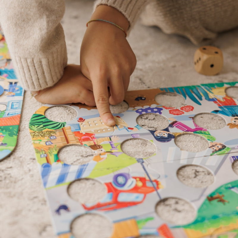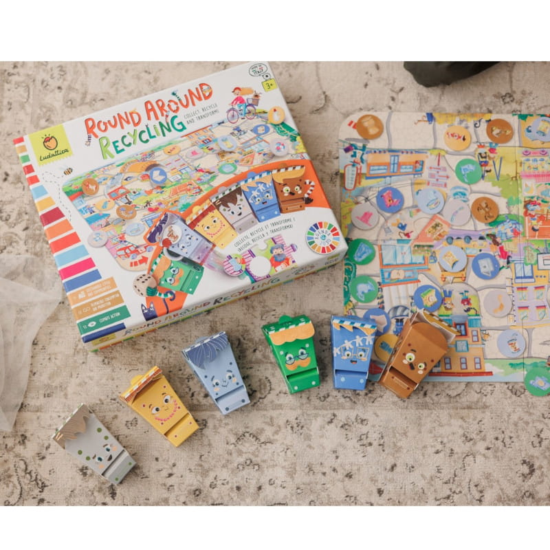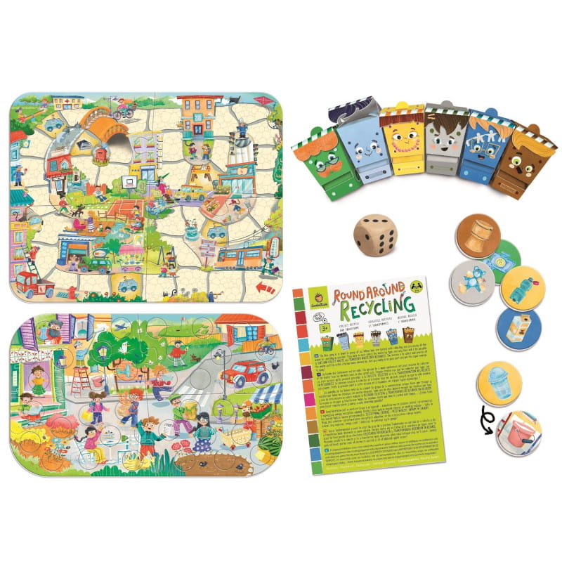 Duże puzzle stają się po ułożeniu planszą do gry. Druga plansza stanowi źródło żetonów ze śmieciami, które trzeba będzie zebrać, odpowiednio segregując. Pionki 3D w postaci koszy na śmieci już czekają aby odpadom nadać nowe życie. Do dzieła!