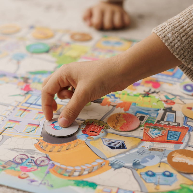 - plansza – miasto – do samodzielnego ułożenia z dużych puzzli. Wielkość po ułożeniu 48,5 x 37 cm
