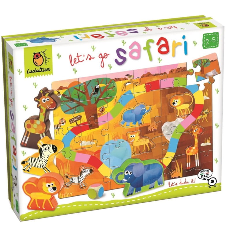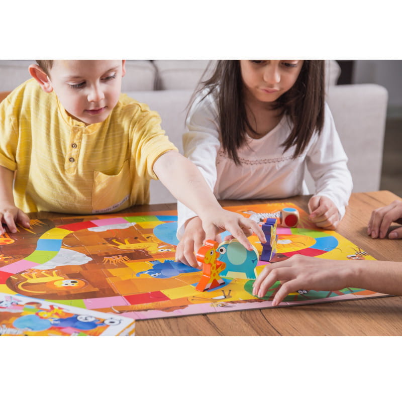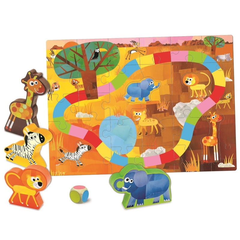 Wyjątkowa propozycja na wprowadzenie malca w świat gier. Duże puzzle ze scenerią sawanny stają się po ułożeniu planszą do gry. Drewniane pionki w kształcie zwierząt podążają trasą z kolorowymi polami. O przebiegu rywalizacji decydują rzuty dużą drewnianą kostką z kolorowymi ściankami. Gra dla dzieci już od 2 roku życia.