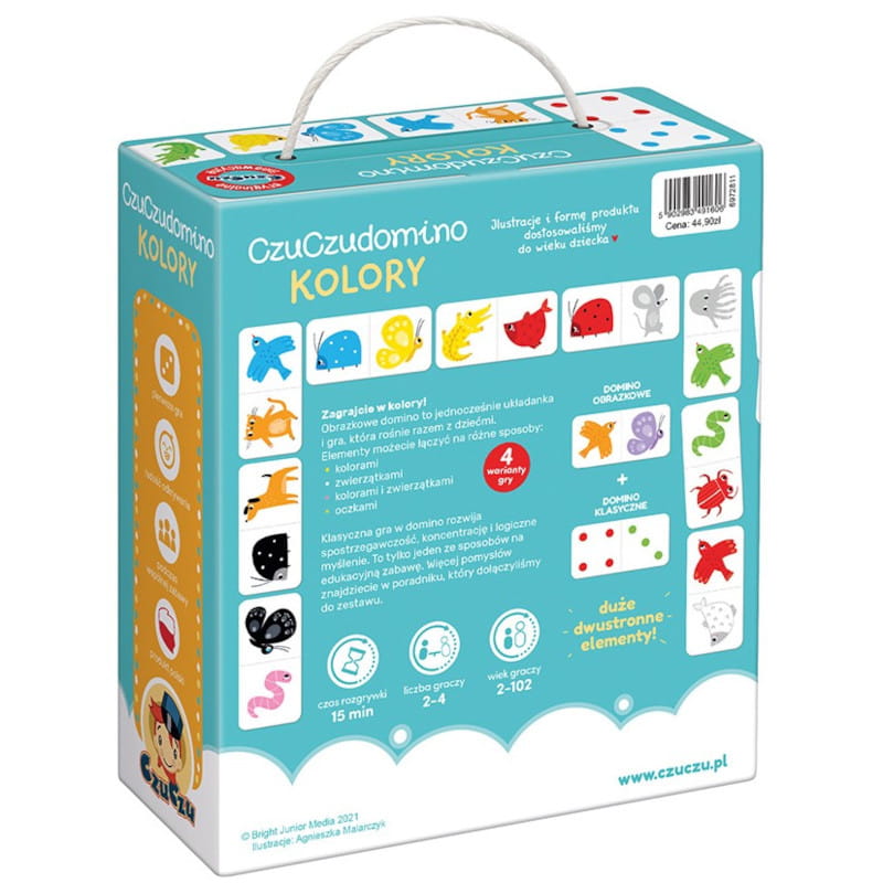 Układanka i gra, która rośnie razem z dziećmi. Elementy można łączyć na różne sposoby: kolorami, zwierzętami, kolorami i zwierzątkami lub tradycyjnymi oczkami.