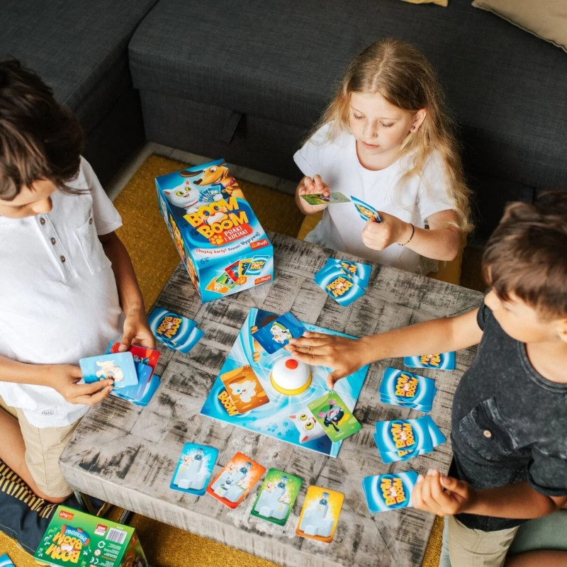 W Boom Boom gracze starają się zebrać zestawy tych samych Psiaków i Kociaków. Wszyscy jednocześnie wymieniają karty z ręki z kartami na planszy. Po zebraniu zestawu gracz uderza w dzwonek, sygnalizując wykonanie zadania. Wydaje się proste, lecz gracze mogą polować na takie same karty. Gracz, który jako pierwszy zbierze odpowiednią liczbę zestawów Psiaków i Kociaków, zostaje zwycięzcą!