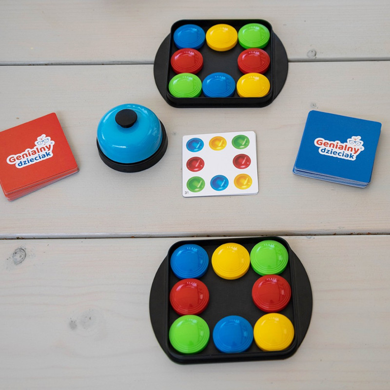 1. Gra przeznaczona jest dla dwóch graczy. Każdy gracz otrzymuje jedną plastikową planszę z kolorowymi pionkami. Karty do gry są losowo umieszczane z wzorami do dołu. Ustaw dzwonek w zasięgu graczy.