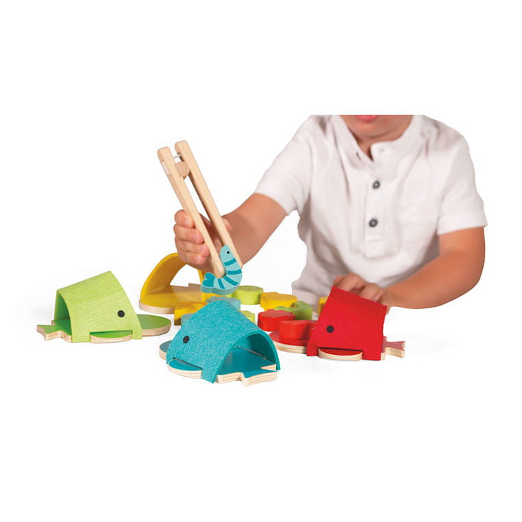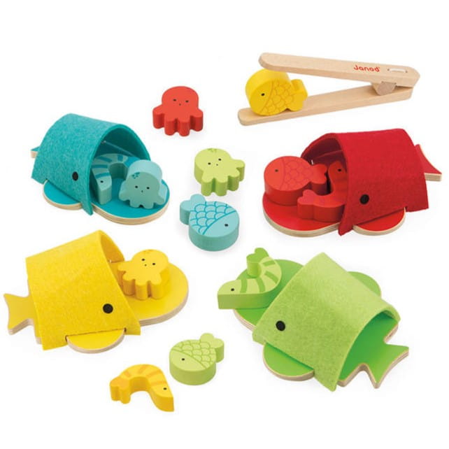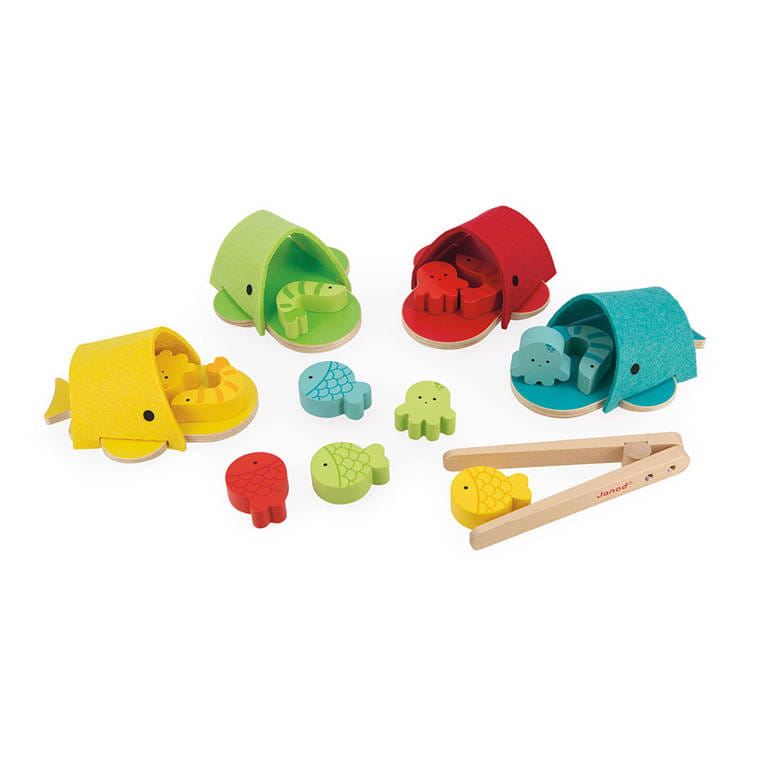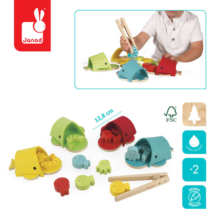 - drewnianych szczypiec do chwytania stworzonek i umieszczania ich w paszczy odpowiadającego im kolorem wieloryba – na zasadzie sortera.