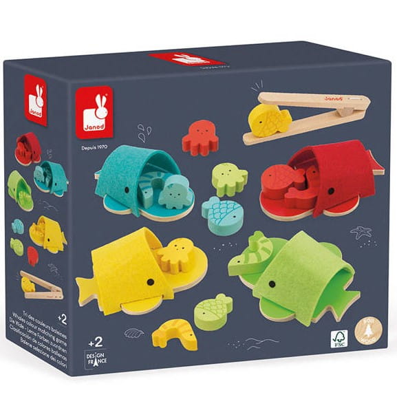 Gra w dopasowywanie kolorów Wieloryby francuskiej marki JANOD to kreatywna zabawka dla kilkulatka, który uczy się rozróżniać i dopasowywać kolory i kształty oraz trenuje chwyt i tzw. małą motorykę.