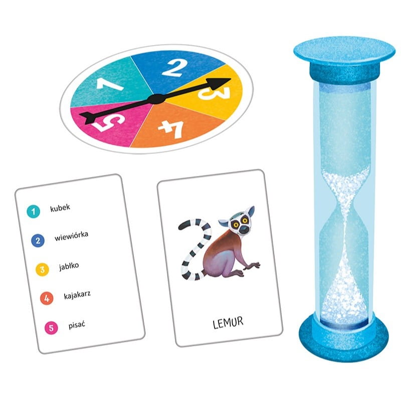 Zestaw zawiera 56 kart, klepsydrę, koło losujące i instrukcję gry.
