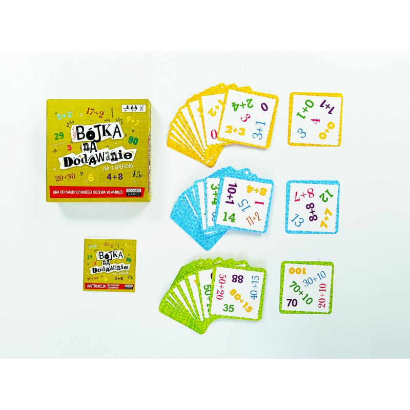 Bójka na dodawanie to gra dla dzieci rozpoczynających naukę dodawania w pamięci, która pozwala nabrać swobody w liczeniu oraz przygotowuje do kolejnych etapów edukacji matematycznej: odejmowania, mnożenia i dzielenia. Dzięki połączeniu nauki z zabawą dziecko szybko rozwija zdolności matematyczne. Im więcej rozgrywek, tym lepiej! To także świetny trening koncentracji i spostrzegawczości, dzięki czemu dziecko ćwiczy refleks, uczy się skupienia i logicznego myślenia.