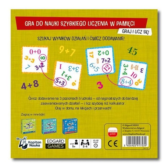 Na kartach do gry znajdują się działania dodawania oraz sumy przedstawione za pomocą kolorowych zapisów działań i wyników, tak aby zaangażować uwagę najmłodszych graczy na dłużej.
