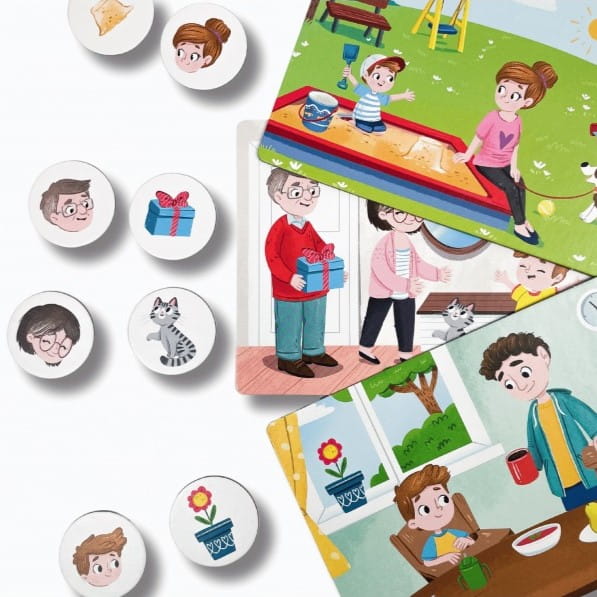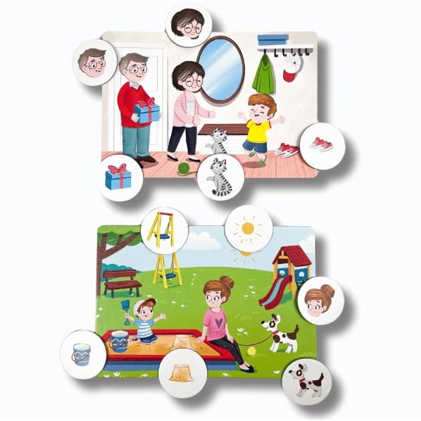 Gra zawiera barwne plansze, na których znajdziecie ilustracje przedstawiające małego Stasia podczas ważnych codziennych czynności: zabawy w piaskownicy, smacznego posiłku, spaceru, wieczornej kąpieli czy słuchania czytanki na dobranoc. Razem z maluchem możecie obserwować najbliższe otoczenie Stasia, wskazywać palcem przedmioty, układać żetony w różne sekwencje, naśladować dźwięki, odgrywać scenki z życia codziennego, wymyślać historyjki, szukać nowych słów na nazwanie przedmiotów i czynności czy zadawać sobie nawzajem mnóstwo pytań i zagadek! W ten sposób malec nabierze ochoty do opowiadania i poczuje radość ze wspólnych rozmów!