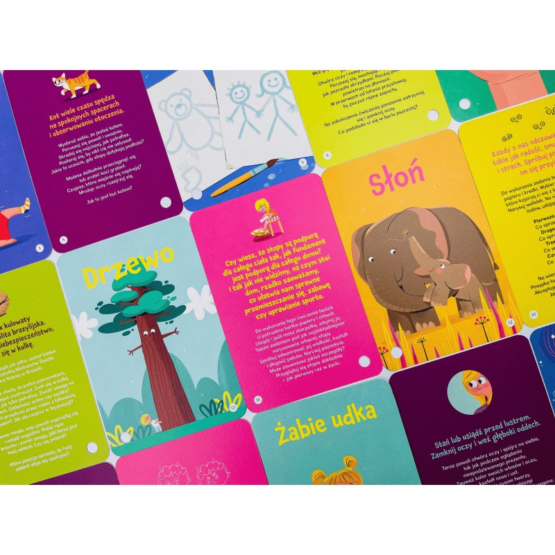 Wylosujcie kartę, spójrzcie na ilustrację i dajcie się zainspirować! Gdy wyobraźnia dziecka zaczyna pracować, rodzic lub nauczyciel czyta opis każdego ćwiczenia. Czujecie się zrelaksowani i świetnie się bawicie! W obszernym zestawie kart czekają na Was m.in. takie wspaniałe pomysły na zabawy, jak: pedałowanie na wyimaginowanym rowerku, wcielanie się w kotka czy pszczółkę, obejmowanie wyobrażonego drzewa, studiowanie budowy swoich rączek lub stópek, a wreszcie – szybowanie w fantazji niczym najpiękniejszy latawiec!