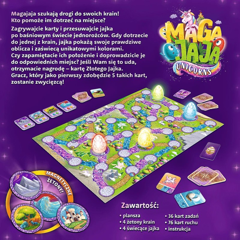 Magajaja Unicorns to bestsellerowa, magiczna gra rodzinna, w której staracie się doprowadzić świecące jajka do odpowiednich krain na planszy. Gra jest przeznaczona dla 2-4 graczy powyżej 6. roku życia, a przewidywany czas rozgrywki wynosi 20-30 minut. Gra rozwija umiejętność logicznego myślenia, kreatywność oraz zdolność zdrowej rywalizacji.