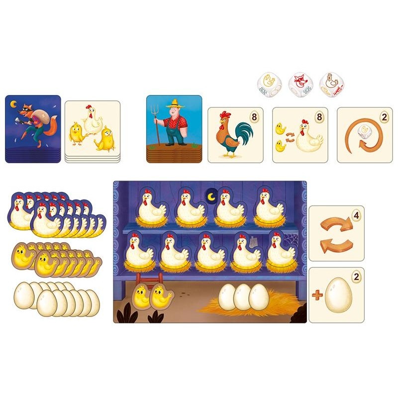 Przerzucaj kości, zbieraj jajka, kurczaki i kury. Dbaj o swój kurnik i wprowadzaj do niego ulepszenia, bo nigdy nie wiesz, kiedy Lis powróci pod osłoną nocy. Planuj, kombinuj i jako pierwszy posadź wszystkie kury na grzędach. Więcej emocji, więcej decyzji i jeszcze więcej Lisa! Zapełnij kurnik i przechytrz Lisa!
