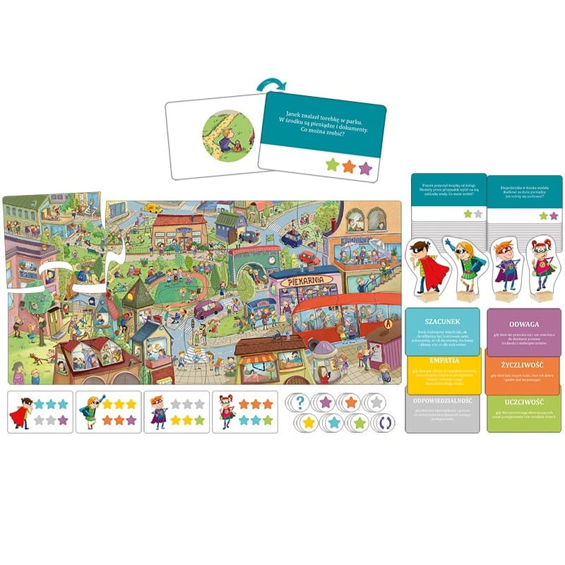 Będziecie uczyć się o różnych wartościach (takich jak: szacunek, uczciwość, odwaga), które stanowią fundamenty życia społecznego. Ta gra to nie tylko świetna zabawa, ale również doskonała okazja do rozmowy o życiowych wartościach.