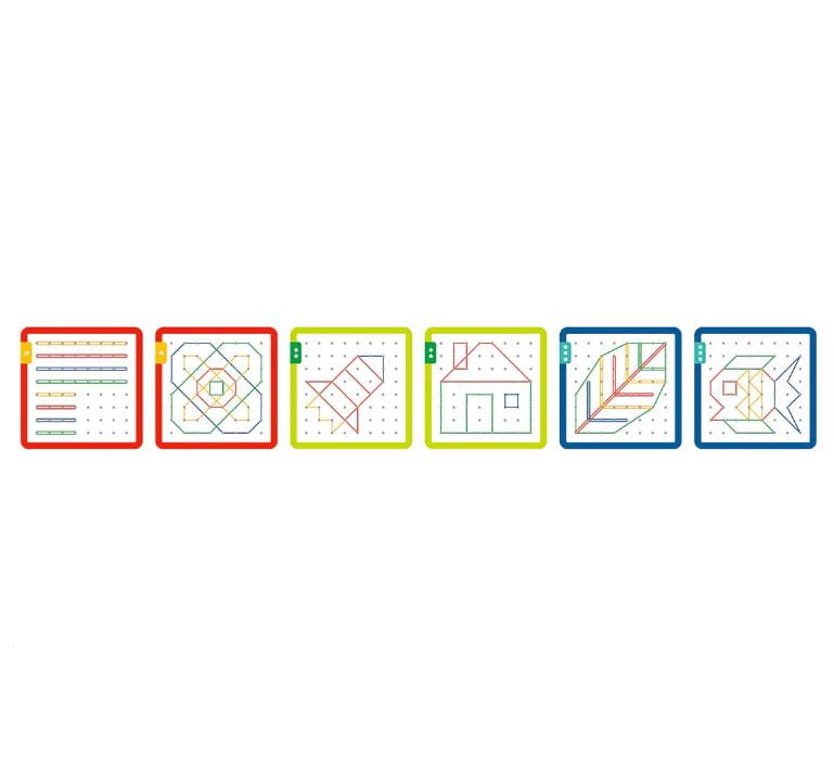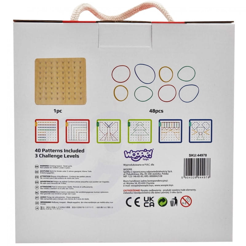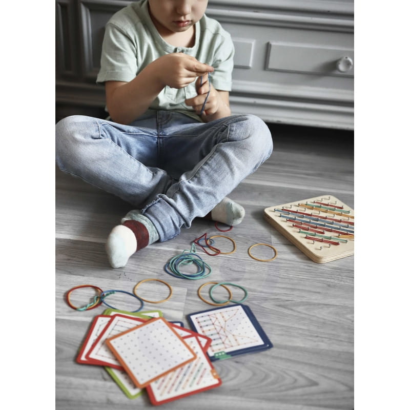 Zestaw składa się z 48 elastycznych gumek oraz z 20 dwustronnych kart z 40 obrazkami o różnym stopniu trudności (3 poziomy).