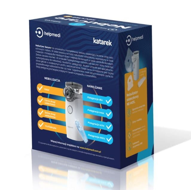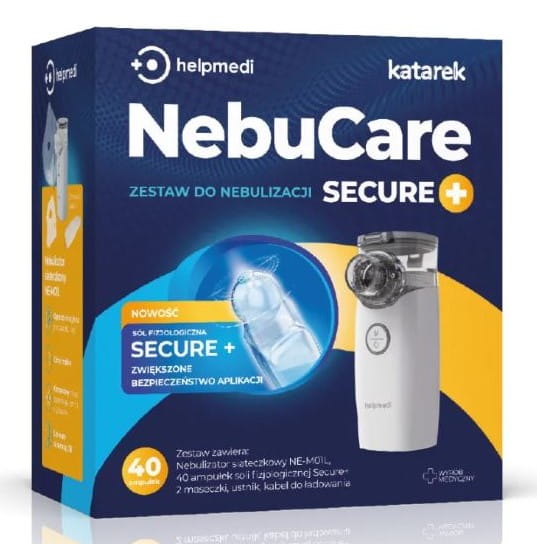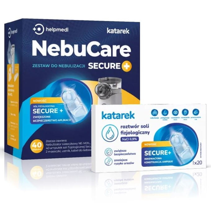NebuCare Secure+ przeznaczony jest do nebulizacji dzieci podczas leczenia różnych schorzeń dróg oddechowych. W skład zestawu wchodzi nebulizator siateczkowy z zestawem dwóch maseczek i ustnika, oraz 40 ampułek roztworu soli fizjologicznej Katarek Secure+ w innowacyjnych ampułkach z okrągłym zakończeniem zapewniającym wyższy poziom bezpieczeństwa, co zmniejsza ryzyko urazów.
