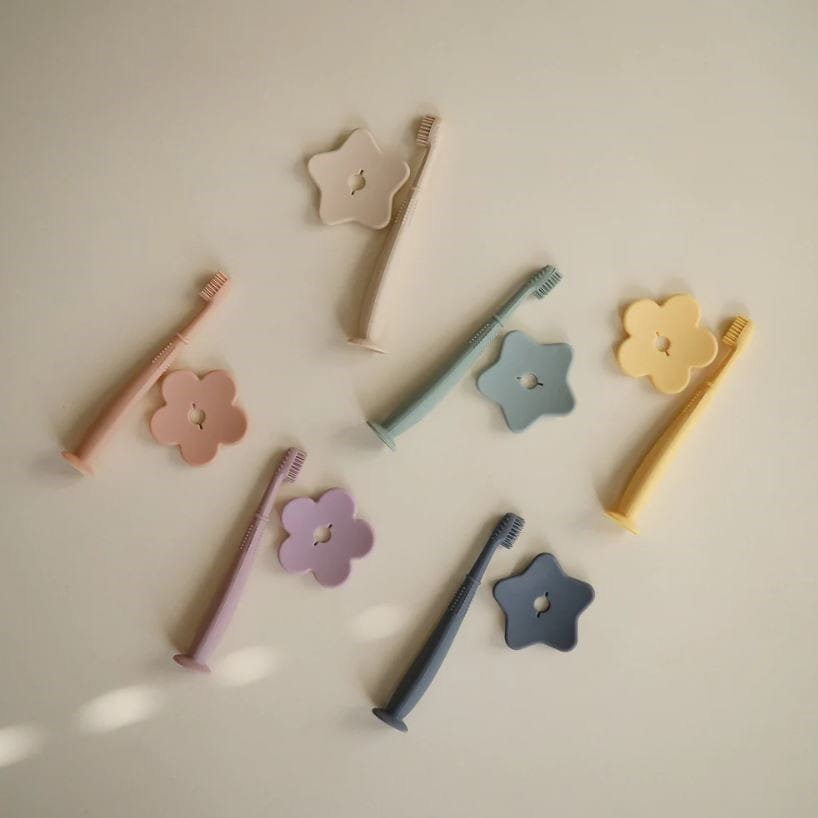 Szczoteczka Mushie została w 100% wyprodukowana z sylikonu spożywczego. Delikatne wypustki oczyszczają i masują ząbki i dziąsła, wygodna podstawka ułatwia przechowywanie, a tarczka w kształcie kwiatka zapobiega zaksztuszeniu.