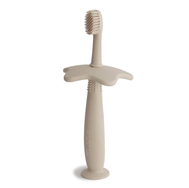 Silikonowa szczoteczka z ogranicznikiem do nauki mycia ząbków marki Mushie.