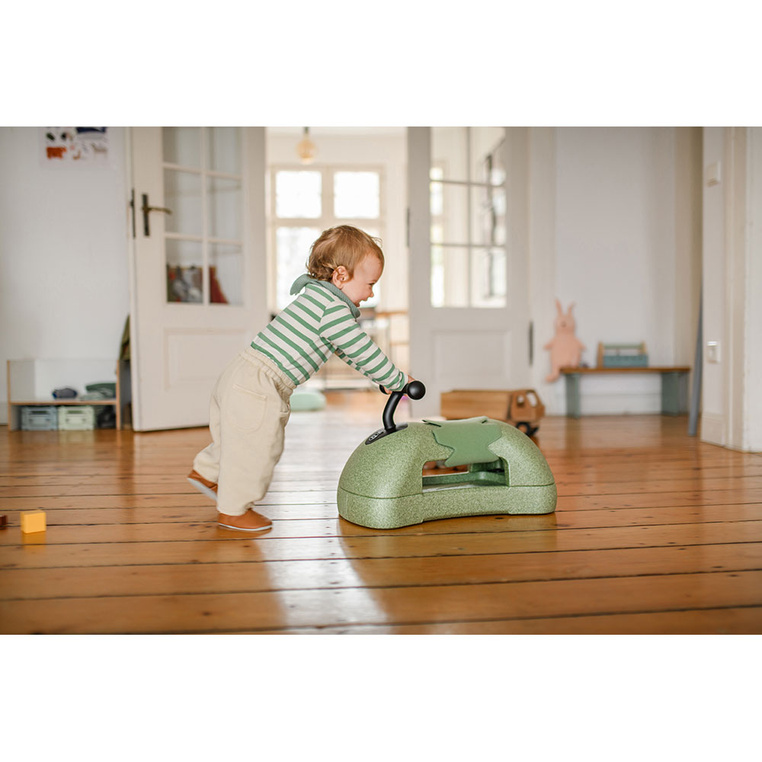 Jako pchacz - dzięki stronie z bezpiecznymi podkładkami ślizgowymi - może być stosowany już od 6. miesiąca życia, od ok. 62 cm wzrostu. Stabilna powierzchnia siedziska, po której można się wspinać, oraz dobre przyleganie do podłogi ułatwia maluchowi naukę wstawania i stawiania pierwszych kroków, a lekkość, profilowana rączka na odpowiedniej wysokości i podkładki ślizgowe pozwalają w bezpieczny sposób prowadzić dziecku pojazd przed sobą. Pod siedziskiem My First posiada przestrzeń, która może być idealnym schowkiem na zabawki – ulubione przytulanki, autka czy klocki.