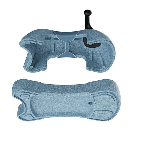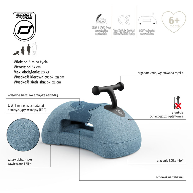 Jeździk został wykonany z niezwykłego materiału – EPP (spienionego polipropylenu), który ze względu na swoje unikatowe właściwości, używany jest m.in. we wnętrzach ochronnych kasków (np. rowerowych) czy do produkcji fotelików samochodowych. Jest to lekkie, a przy tym niezwykle wytrzymałe tworzywo, odporne na działanie czynników zewnętrznych – nie tylko wody czy zmiany temperatury, ale nawet czynników mechanicznych, jak uderzenia. Materiał ten świetnie znosi duże przeciążenia i doskonale amortyzuje wstrząsy, a jednocześnie jest „przyjazny” dla otoczenia - podłogi, ścian czy mebli (przy zderzeniu nie powoduje rys, zagnieceń etc.) i nadaje się do recyklingu.