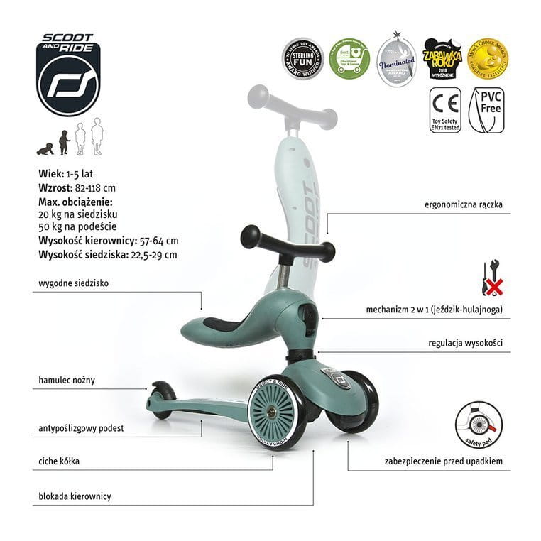 Scootandride 2w1 Highwaykick 1 to innowacyjna jeździko-hulajnoga z siedziskiem austriackiej marki SCOOT&RIDE. To idealny pomysł na wspieranie aktywności dziecka. Jeździk rośnie wraz z dzieckiem stając się hulajnogą służącą do około 5 roku życia! Scoot and ride to wiele innowacyjnych rozwiązań - regulowane siedzisko, zmiana jeździka w hulajnogę to zaledwie chwila nie wymagająca żadnych narzędzi, unikatowy system bezpieczeństwa przed wywróceniem do przodu czyni ten produkt, wyjątkowym, bezpiecznym, trwałym i pięknym.