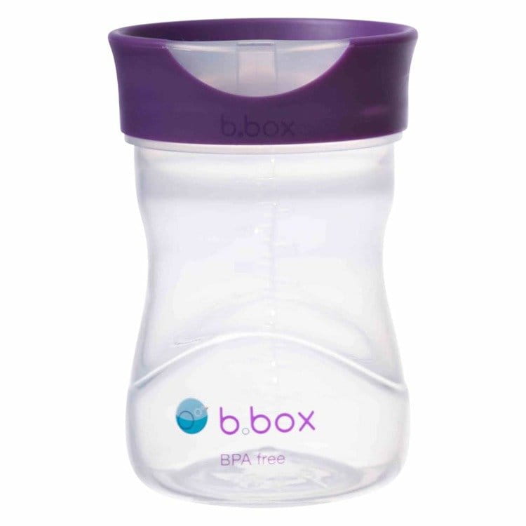 Kubek treningowy Winogronowy fioletowy od marki B.box. Kubek zaprojektowany, aby ułatwić dziecku przejście od niekapka do zwykłego kubka. Pokrywka pozwala pić jak ze szklanki jednocześnie zapobiegając nadmiernemu rozlewaniu płynu przy przechyleniu kubeczka. Kubeczek jest przezroczysty, aby dziecku, widząc ile jest w nim płynu, łatwiej było ocenić jak bardzo należy nachylić kubeczek.