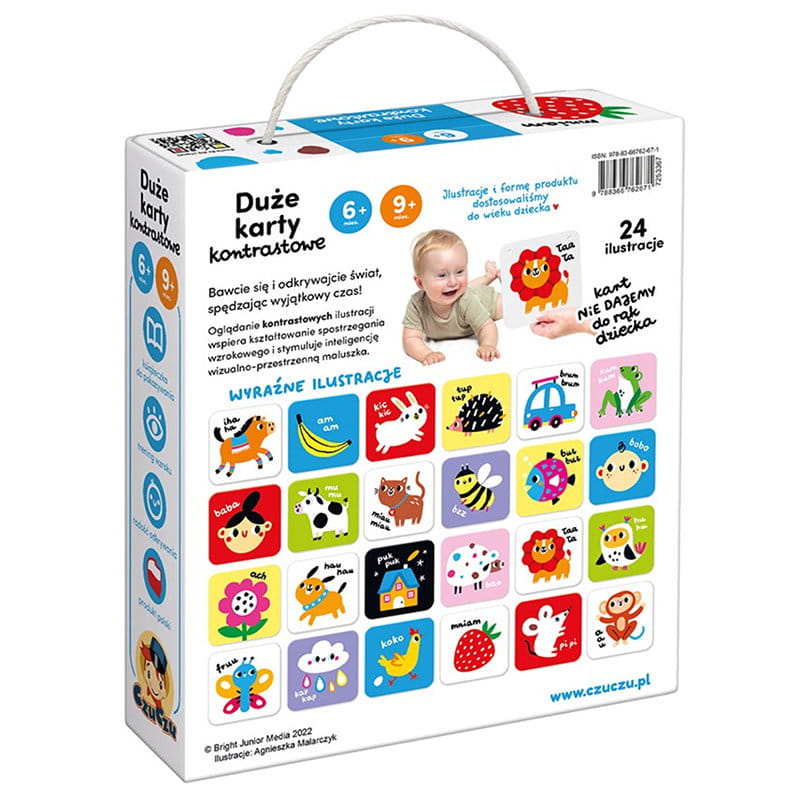 Duże karty kontrastowe od CzuCzu dla starszych niemowląt (6-9 mies.+) to wyjątkowa książeczka. Jest pełna prostych, kolorowych ilustracji, które dają ogrom możliwości zabawy. Przyciągają wzrok i uwagę malucha, zachęcają do przemieszczania się. Podpowiedzi dźwięków inspirują do mnóstwa zabaw w wydawanie odgłosów, co wspiera rozwój słuchu i mowy. Co ważne, maluchy to uwielbiają! Wspólne czytanie i zabawy budują bliskość z dzieckiem.