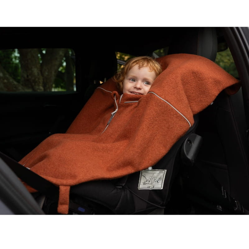 Wersja wełnianego poncza do fotelika została zaprojektowana w taki sposób, by była jak najwygodniejsza i najbardziej praktyczna w użytkowaniu.