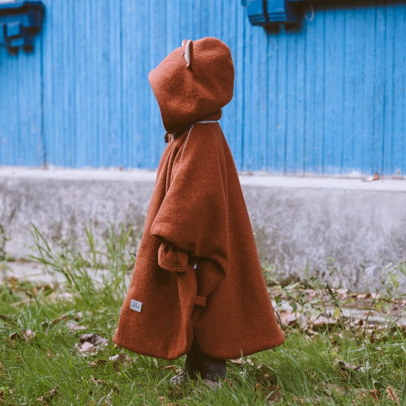 Wełniane ponczo do fotelika w jednym, uniwersalnym rozmiarze, dedykowane dzieciom w wieku od 2 do 6 lat.