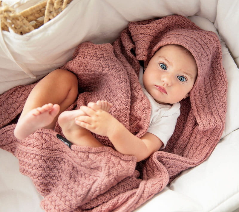 Kocyk z wełny merino o splocie nazwanym ciasteczko marki Lullalove.