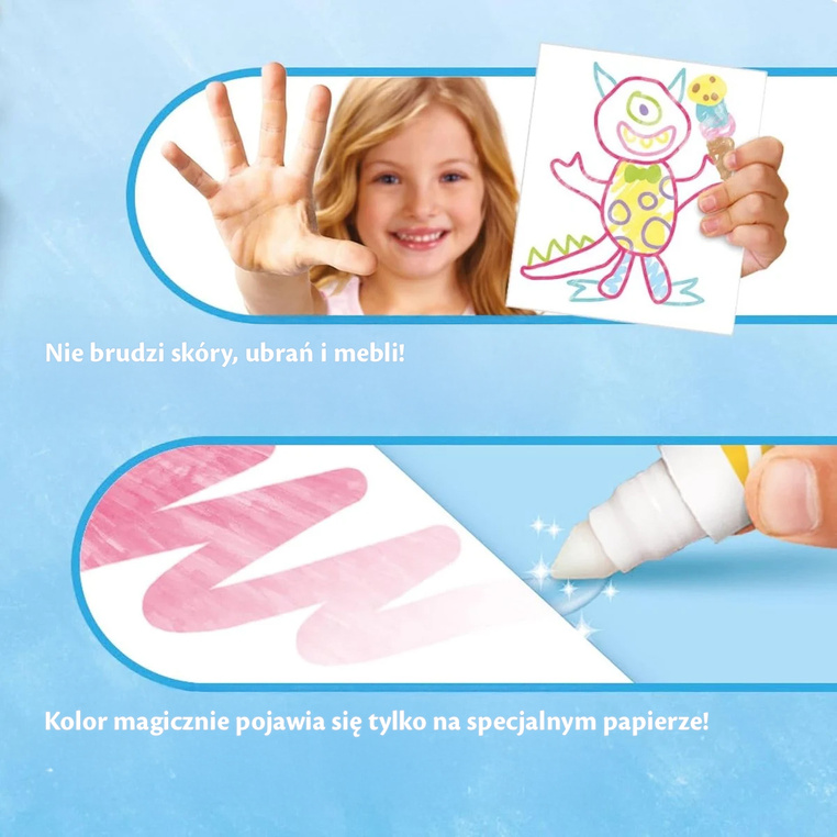 - Zabawa bez zabrudzeń – kolor widoczny jest tylko na specjalnym papierze, który można dokupić również oddzielnie