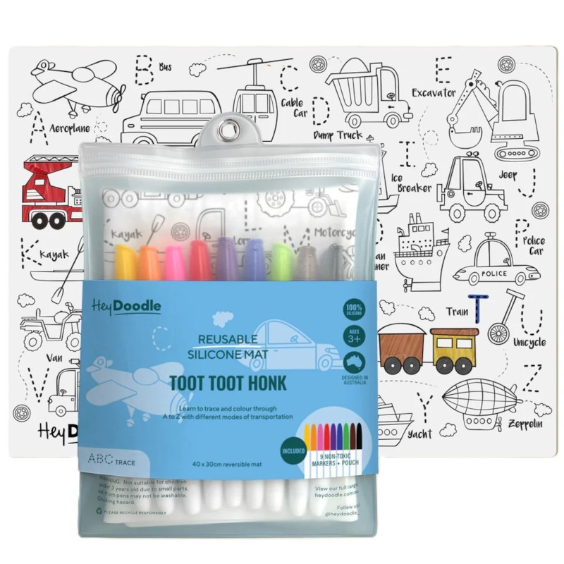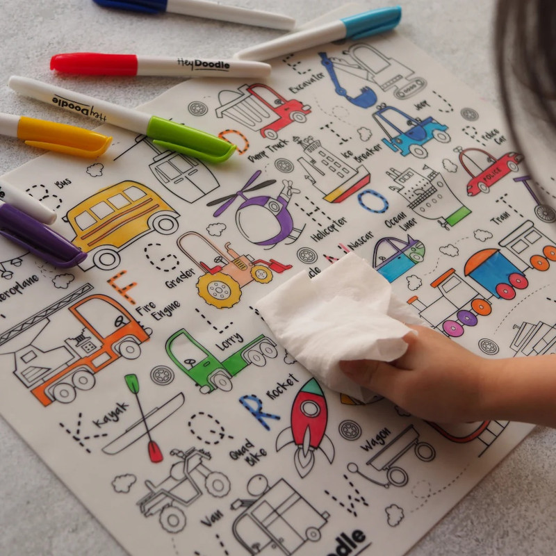 Koloruj i ćwicz pisanie literek, ucząc się nazw w języku angielskim. Silikonowa mata A3 ma do kolorowania pojazdy i literki do pisania po śladzie, na które zaczyna się nazwa pojazdu w języku angielskim. Po zabawie matę można wyczyścić i użyć ponownie, ponownie i ponownie kolorując, pisząc i ucząc się!
