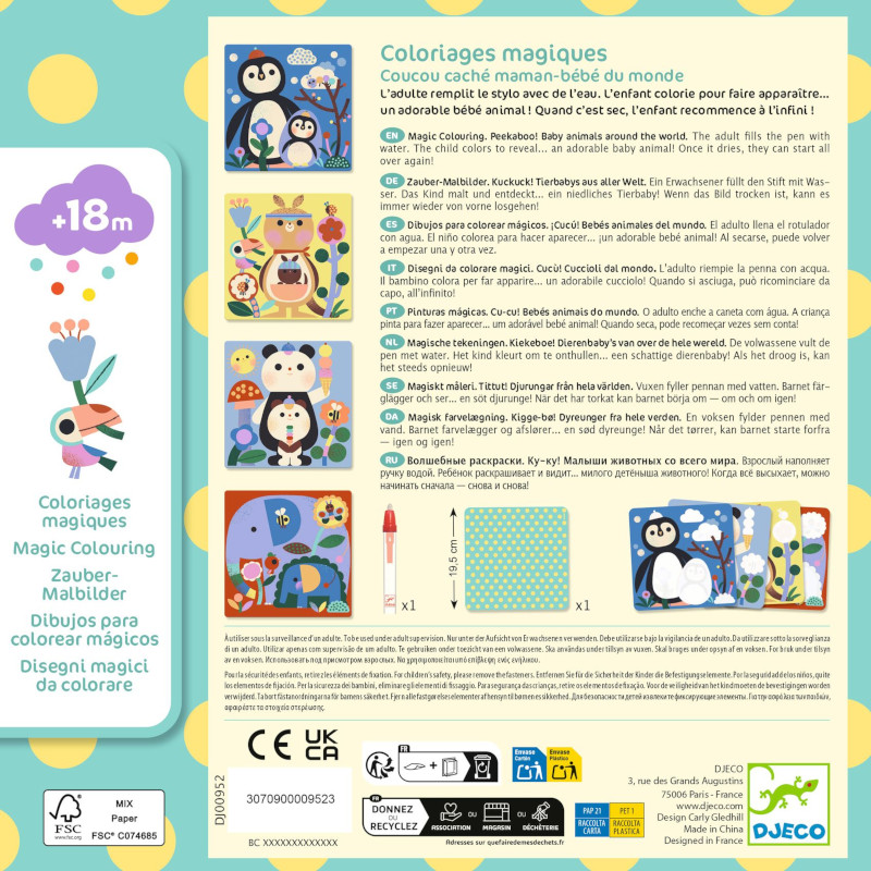 Woda odsłania niespodzianki, które ukrywają obrazki - mamy zwierzątka i ich dzieci! Gdy strony wyschną, zabawa zaczyna się od nowa!