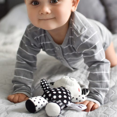 Czarno-białe kolory stymulują zmysł wzroku u niemowlaka, który jeszcze nie rozróżnia barw. Dzięki zabawce dziecko rozwija koordynacje wzrokowo-słuchową i motoryczną.