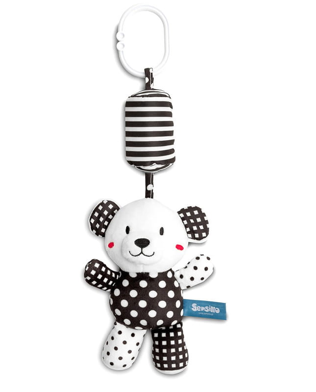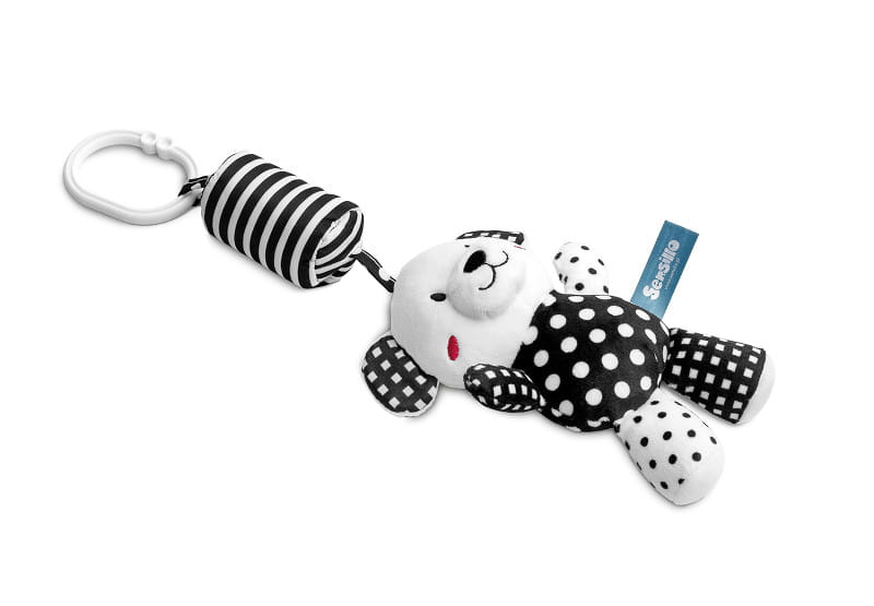 Pluszowa zawieszka do wózka Black&White przykuwa uwagę dziecka nie tylko charakterystycznym czarnobiałym kolorem, ale również przyjemnym dla ucha dzwoneczkiem. Maskotka posiada uniwersalny uchwyt, który pozwala na zamocowanie w dowolnym miejscu, w domu lub podróży. Dodatkowymi atrakcjami dla maluszka są szeleszczące uszy oraz piszczek schowany w brzuszku.