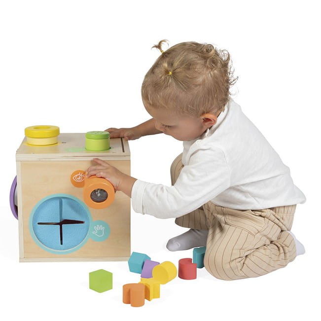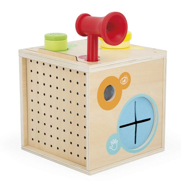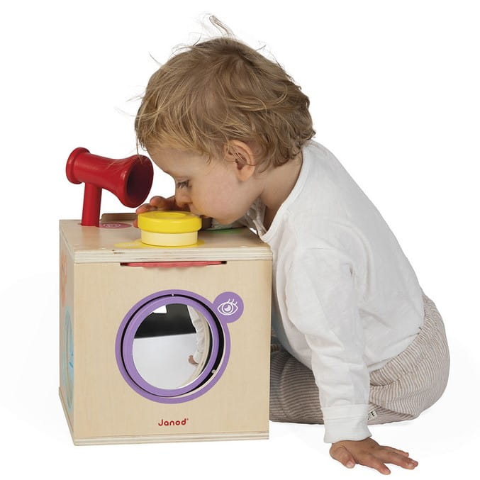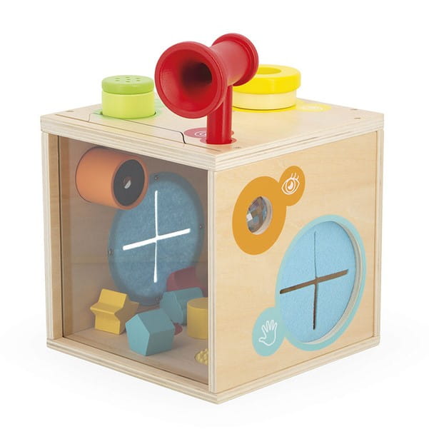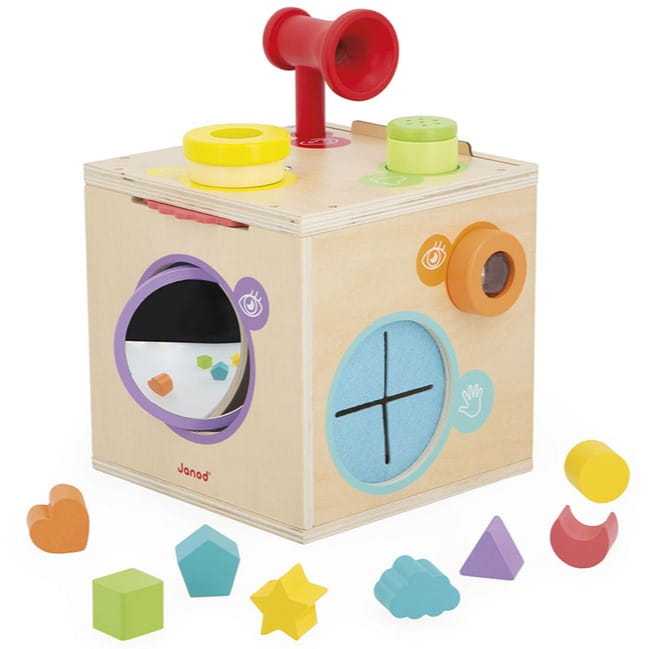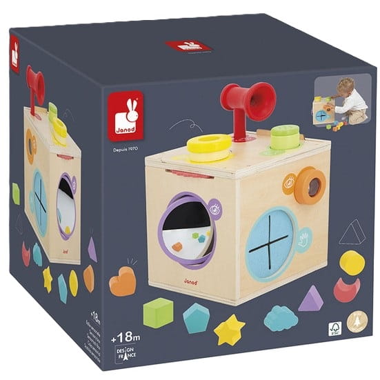 Drewniana wielofunkcyjna kostka sensoryczna francuskiej marki JANOD.