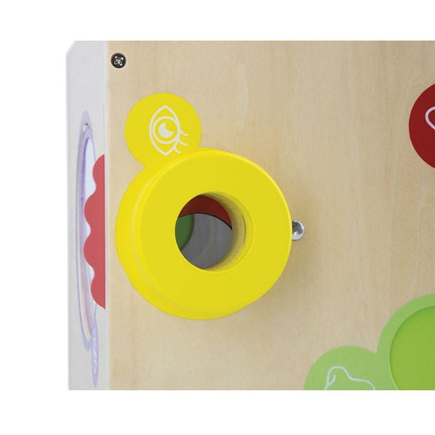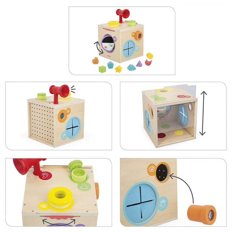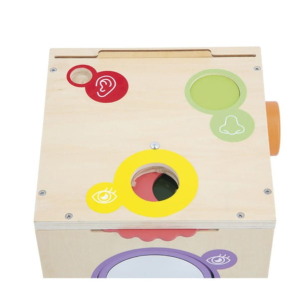 Dzięki zdejmowanym panelom (drewnianemu i przezroczystemu), można regulować dopływ światła do środka, co urozmaica zabawę i wpływa na trudność rozpoznawania kształtów. Dodatkowo, każdemu zmysłowi przypisano osobny kolor i symbol, co ułatwia dziecku orientację i wspiera naukę.